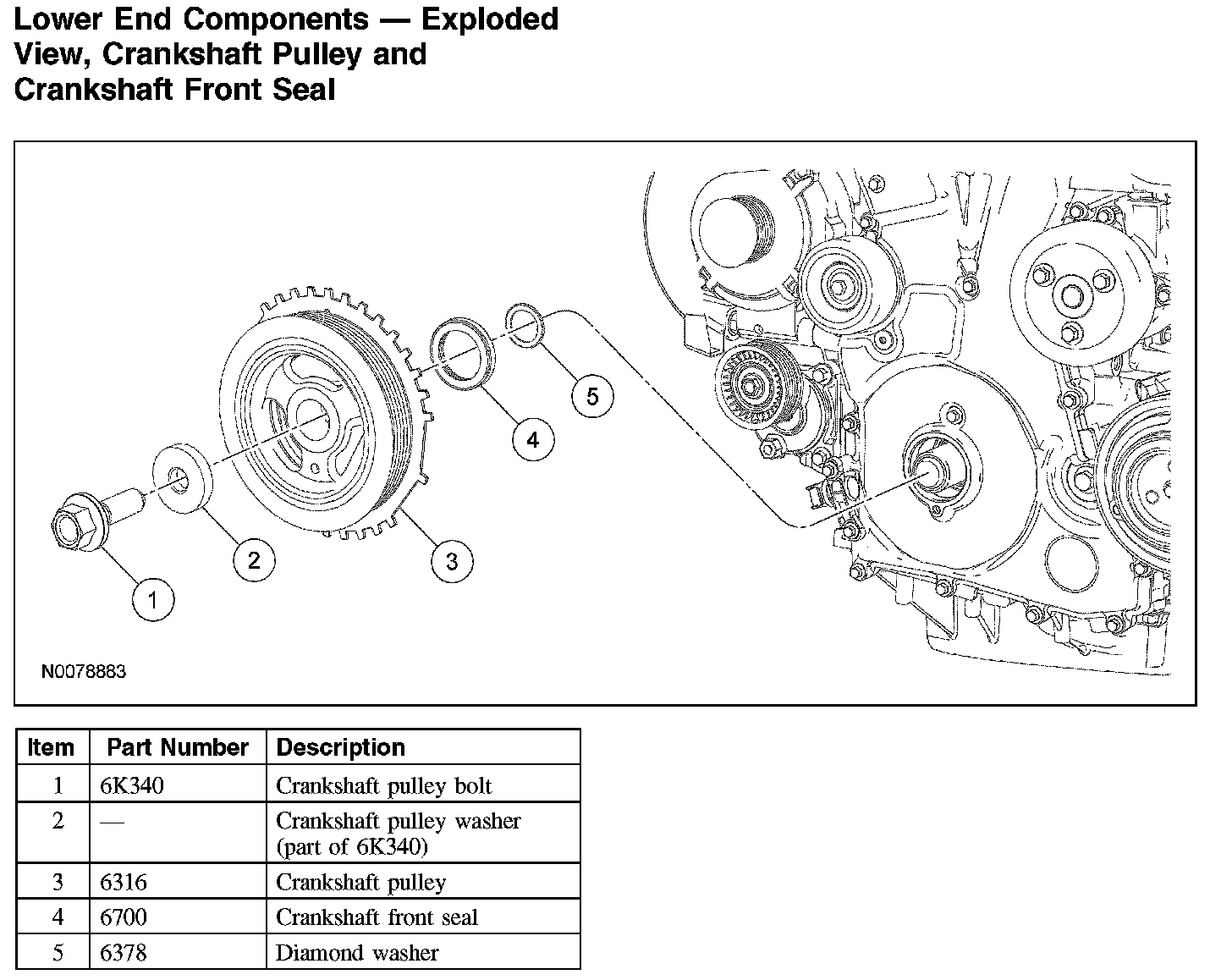 Lower End Components - Exploded View, Crankshaft Pulley and Crankshaft Front SealLower End Components - Exploded View, Crankshaft Pulley and Crankshaft Front Seal: