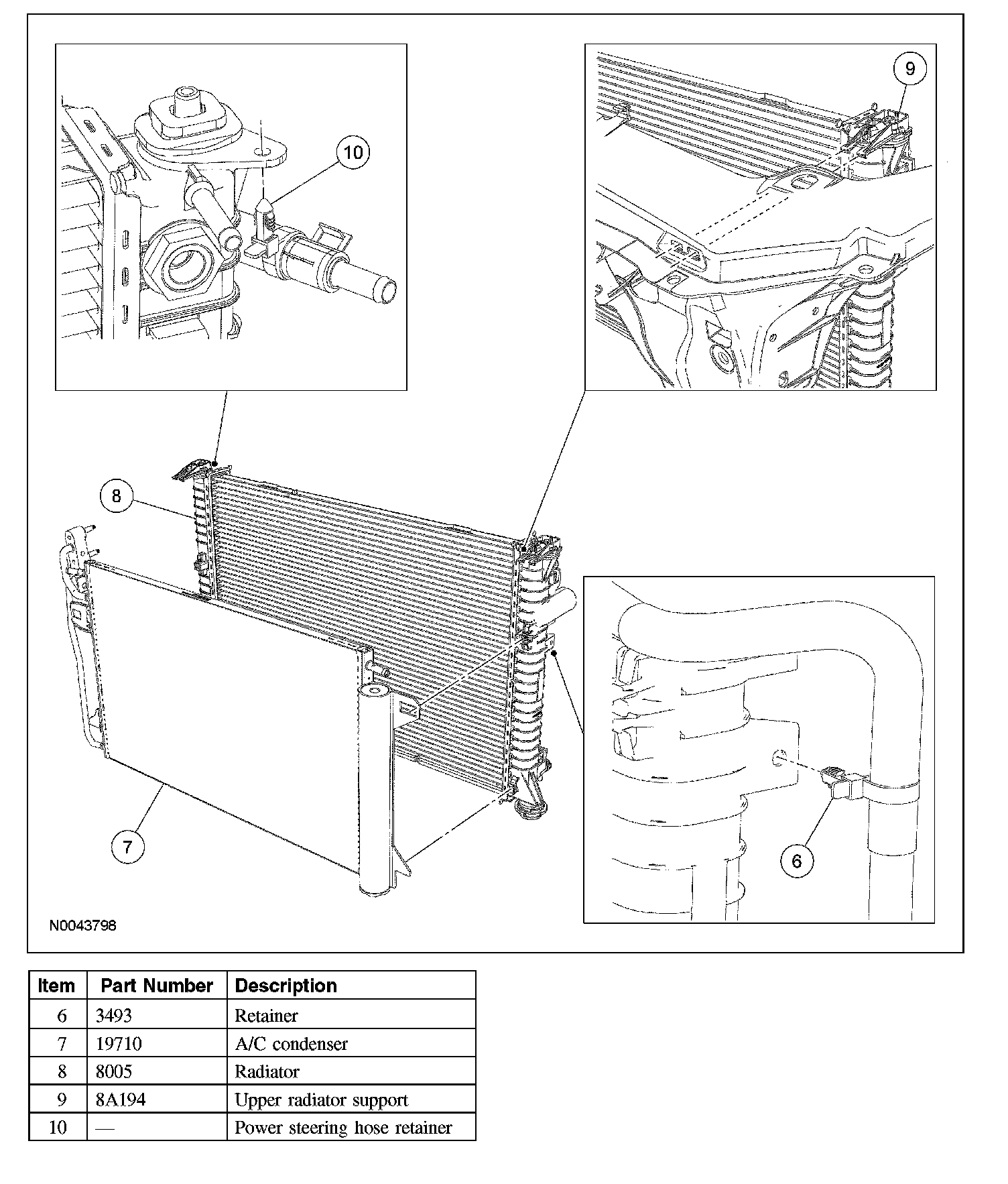 9. Lift and remove the tabs from the upper radiator support and position the radiator towards the engine.