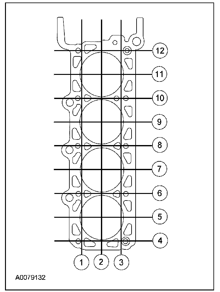 Using a straightedge and a feeler gauge, inspect the cylinder head for flatness in the sequence shown.