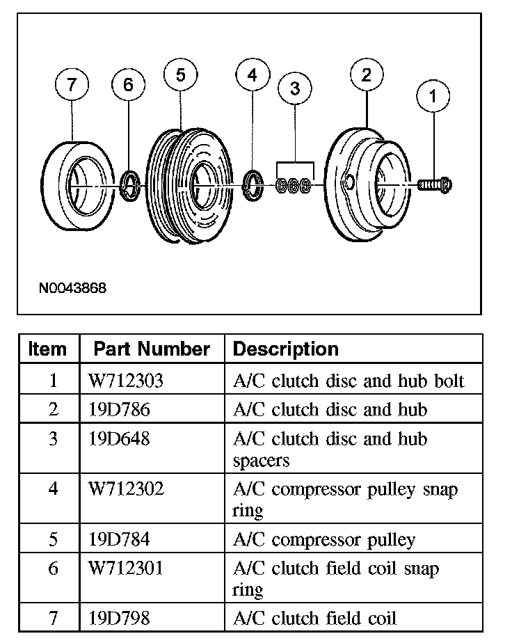 A/C COMPRESSOR AND CLUTCH ASSEMBLYNOTE: Internal A/C compressor components are not serviced separately. The A/C compressor is serviced only as an assembly. The clutch disc and hub, A/C compressor pulley and bearing and clutch field coil are serviceable.