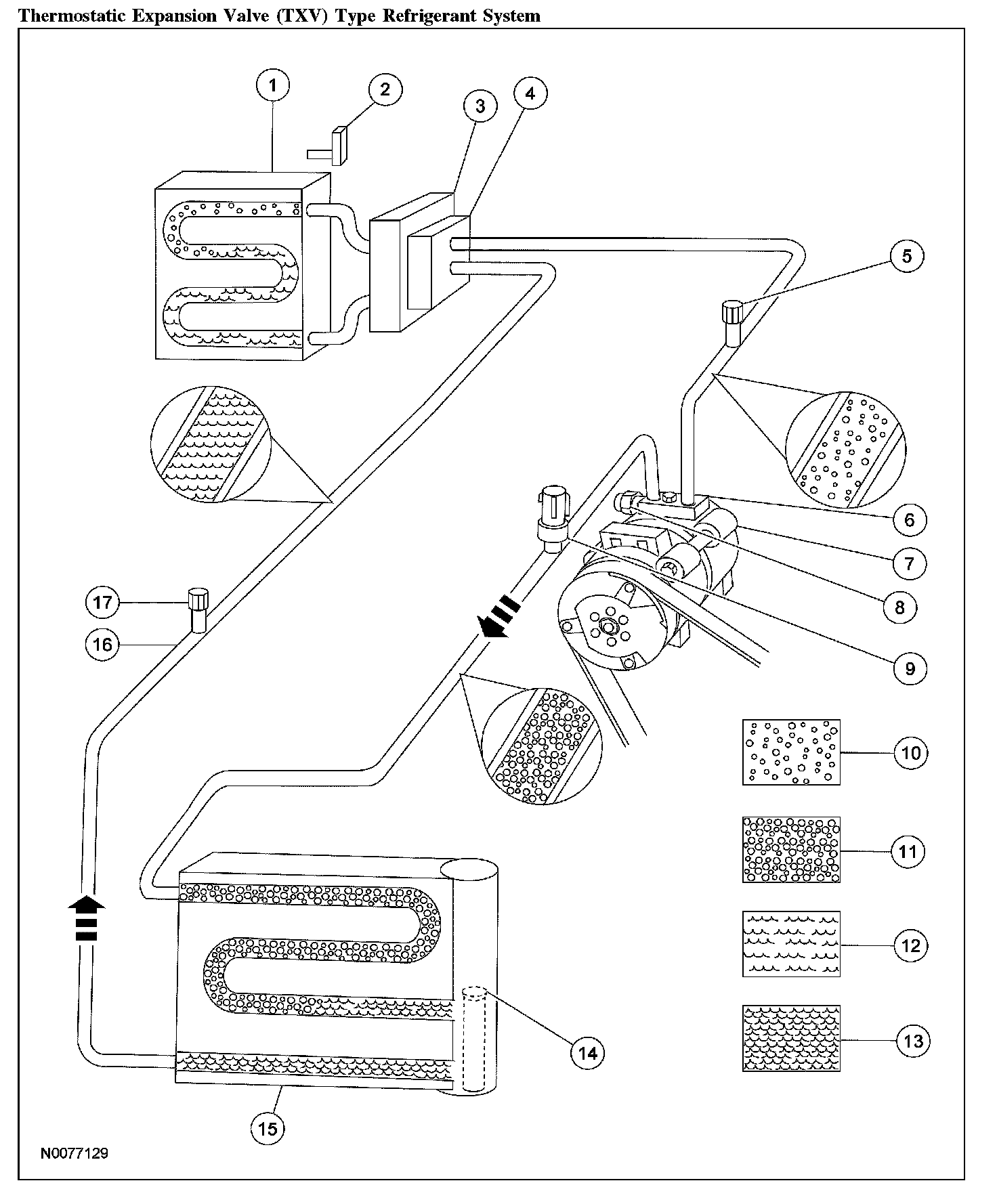 The outlet of the receiver/drier is connected to the thermostatic expansion valve (TXV). The TXV provides the orifice which is the restriction in the refrigerant system and separates the high- and low-pressure sides of the A/C system. As the liquid refrigerant passes across this restriction, its pressure and boiling point are reduced.