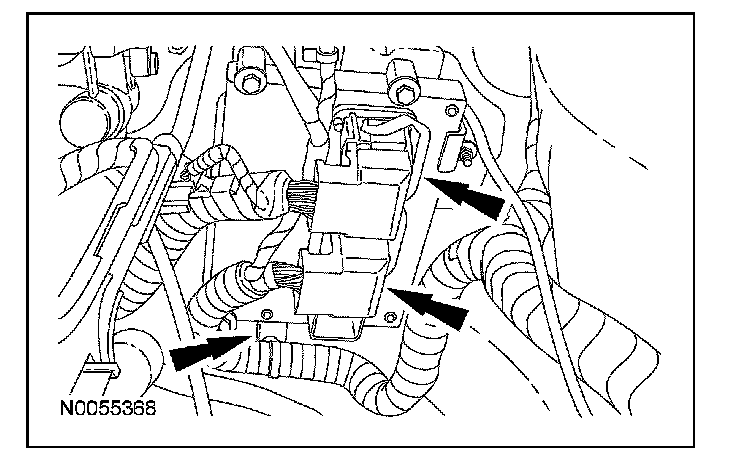 ^ Detach the wiring harness retainer from the PCM bracket, position harness aside.