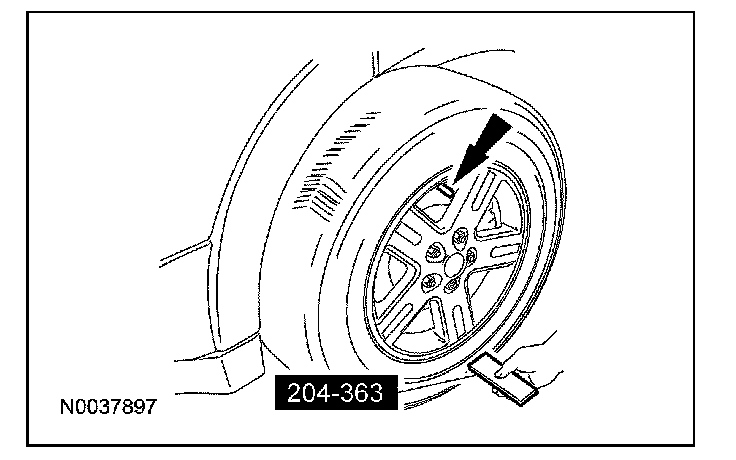 Place the activation tool on the LF tire sidewall opposite (180 degrees) from the valve stem. Press and release the test button on the special tool. The horn will sound briefly to indicate that the tire pressure sensor has been recognized by the SJB.