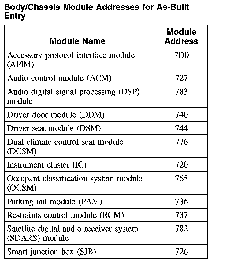 Body/Chassis Module Addresses For As-Built Entry: