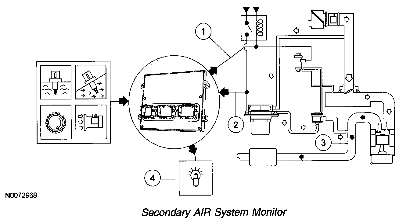The secondary air injection (AIR) system monitor is an on-board strategy designed to monitor the correct function of the secondary air injection system. The AIR monitor for the secondary air injection pump system consists of 2 monitor circuits: an AIR circuit to diagnose concerns with the primary circuit side of the AIR relay, and an AIR monitor circuit to diagnose concerns with the secondary circuit side of the AIR relay. A functional check is also carried out that tests the ability of the AIR system to inject air into the exhaust. The functional flow test relies on the mass air flow (MAF) sensor to determine the presence of air flow. The monitor check for specific changes in MAF input with the secondary AIR pump ON compared to secondary AIR pump OFF for failure detection. The integrity of the secondary AIR pump, inlet house, outlet house and related secondary AIR mechanical components are all checked during the functional flow test. The monitor is enabled during AIR system operation and only after certain base engine conditions are first satisfied. Input is required from the engine coolant temperature (ECT) or cylinder head temperature (CHT), mass air flow/intake air temperature (MAF/IAT), crankshaft position (CKP) sensors and the H02S monitor test must also have passed without a fault detection to enable the AIR monitor. The AIR monitor is also activated during on-demand self-test.