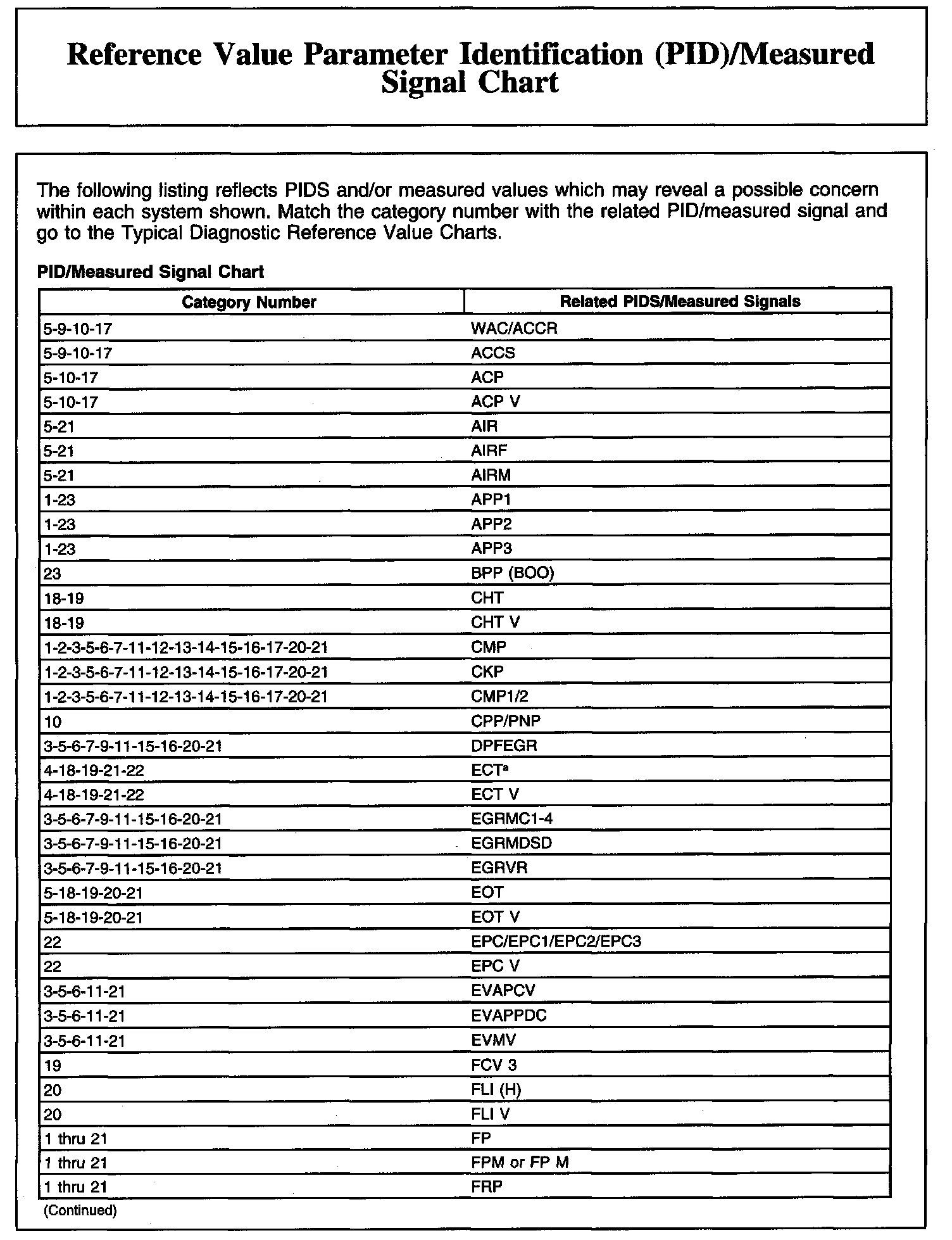 Reference Value Parameter Identification (PID)/Measured Signal Chart (Part 2):