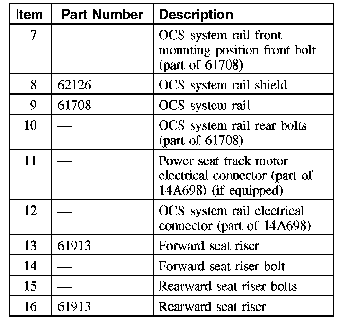 - Do not disassemble the occupant classification sensor (OCS) rail or tighten or loosen any of the nuts and bolts installed to the OCS rail body. Only the 8 bolts that attach the 2 OCS rails to the seat track may be removed and installed. Failure to follow these instructions may result in incorrect operation of the OCS system and increase the risk of serious personal injury or death in a crash.