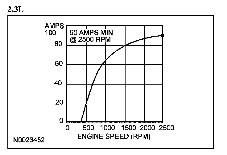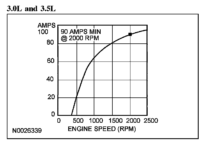 4. With the engine running at approximately 2,500 rpm (2.3L), 2,000 rpm (3.0L and 3.5L), adjust the tester load bank to determine the output of the generator. Generator output should be greater than the graph shown below. If not, refer back to the pinpoint test or GO to Symptom Chart. Pinpoint Tests Symptom Related Diagnostic Procedures