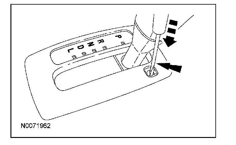 3. Using an suitable tool, depress the brake shift interlock override mechanism on the selector lever, apply the brake, depress the button on the selector lever and move the selector lever into NEUTRAL.