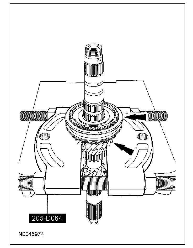 Using the special tools, press on the synchronizer blocking ring and synchronizer hub assembly.