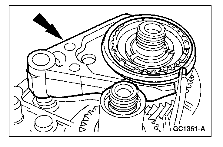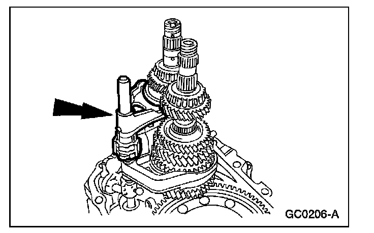 15. Remove the reverse/5th shift fork and synchronizer hub assembly.