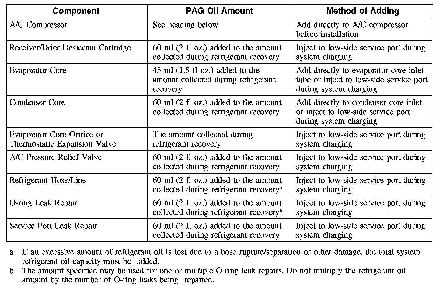 CAUTION: During normal A/C operation, oil is circulated through the system with the refrigerant, and a small amount is retained in each component. If certain components of the system are removed, some of the refrigerant oil will go with the component. To maintain the original total oil charge, it is necessary to compensate for the oil lost by adding oil to the system with the new part.
