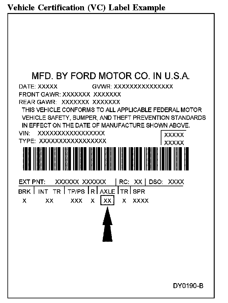 The vehicle certification (VC) label is located in the driver door jamb. The axle code is on the VC label. Refer to Vehicle/Application and ID.