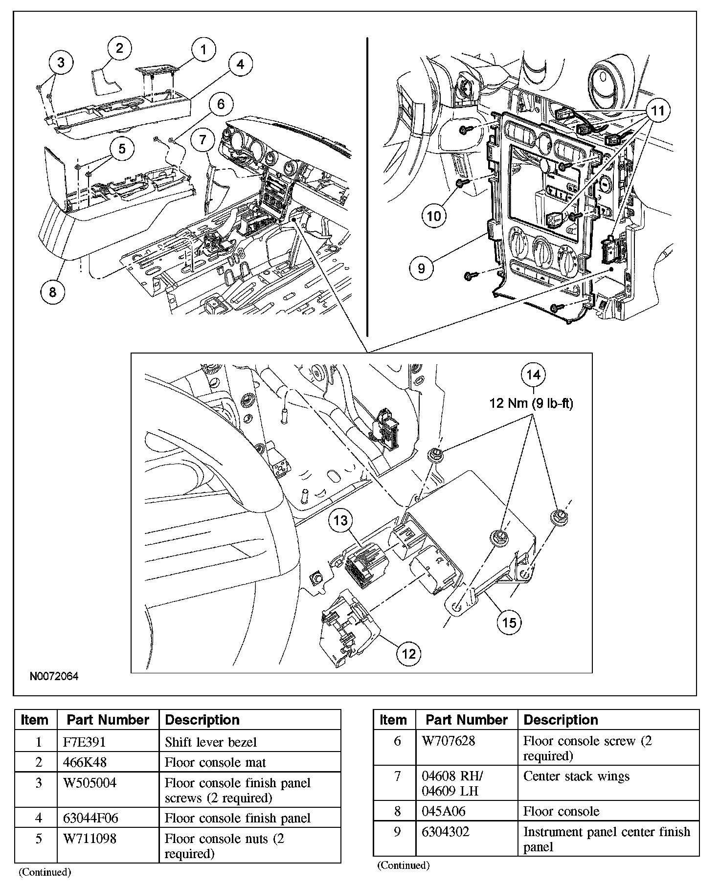 8. Remove the mat, the 2 floor console nuts and position the floor console away from the instrument panel.