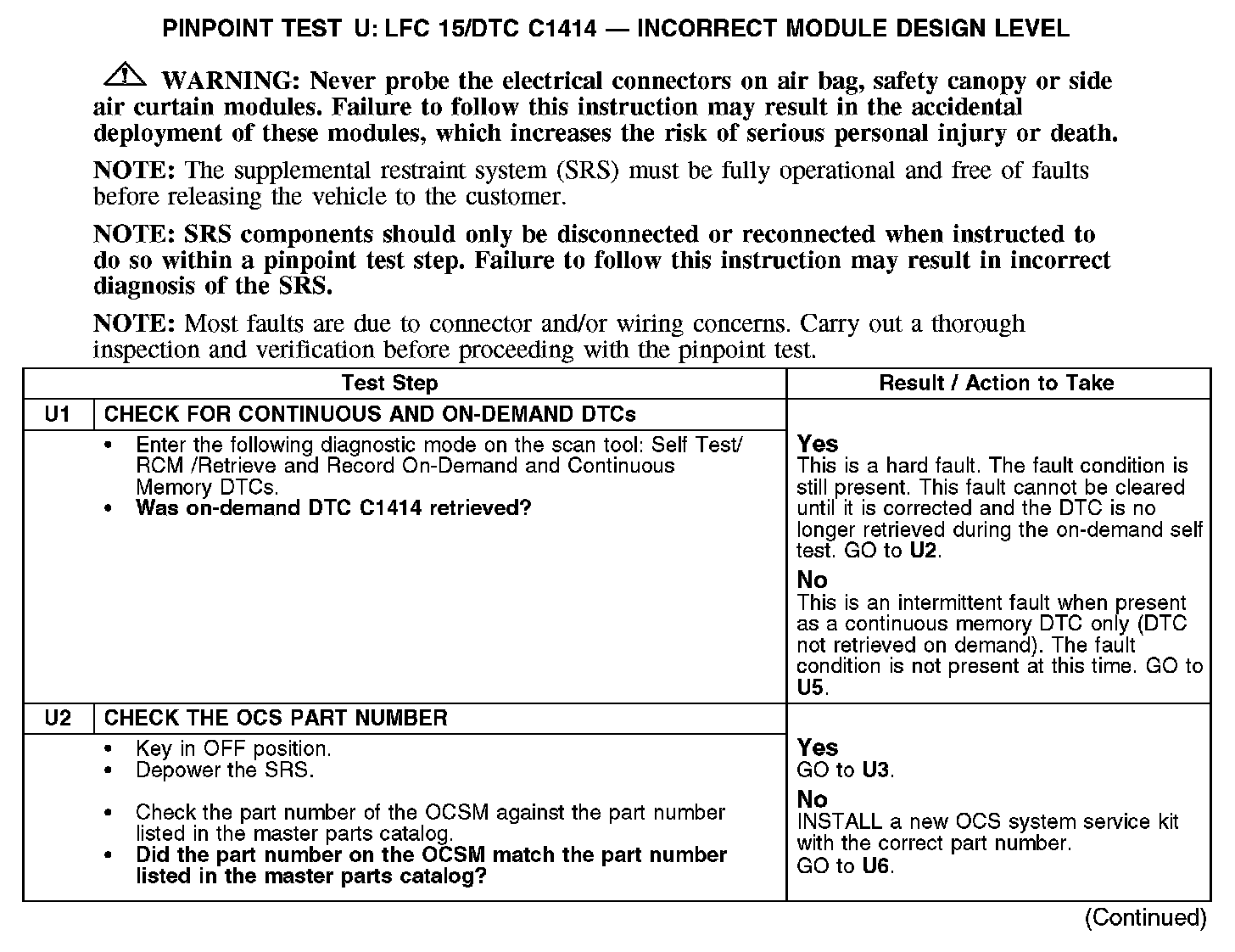 The restraints control module (RCM) monitors the communication condition and circuits of the occupant classification system module (OCSM) for an embedded vehicle ID. If the RCM detects an unexpected condition or code from the OCSM, it will store DTC C1414 in memory and flash LFC 15 (or higher priority code if one exists) on the air bag warning indicator.