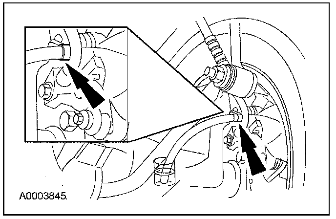 14. Loosen the RH front brake caliper inner bleeder screw until a stream of brake fluid comes out. While the assistant maintains pressure on the brake pedal, tighten the bleeder screw.