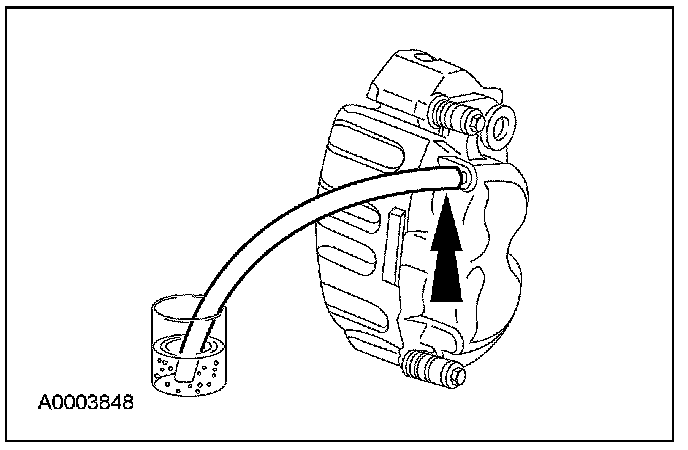 4. Loosen the RH rear brake caliper bleeder screw until a stream of brake fluid comes out. While the assistant maintains pressure on the brake pedal, tighten the bleeder screw.