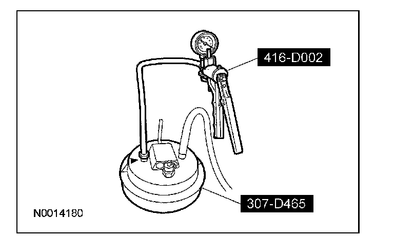12. Apply a maximum of 206.85 kPa (30 psi) to the open end of the vacuum/pressure hose from the special tool. Fluid will immediately start flowing out of the special tool into the transmission fluid pan.