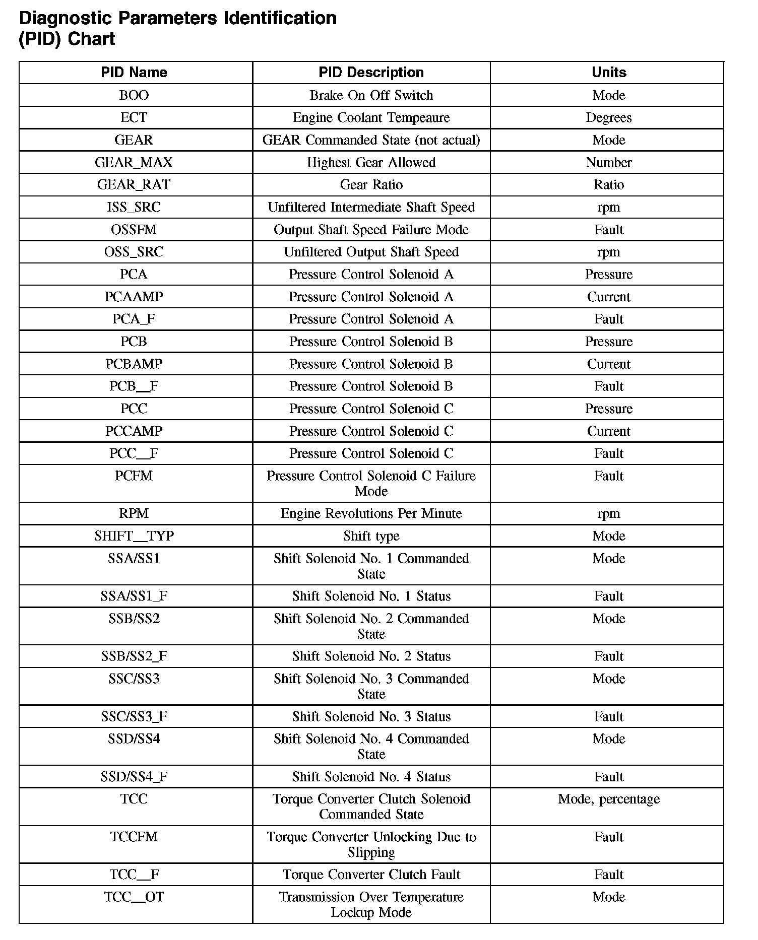 Diagnostic Parameters Identification (PID) Chart (Part 1):