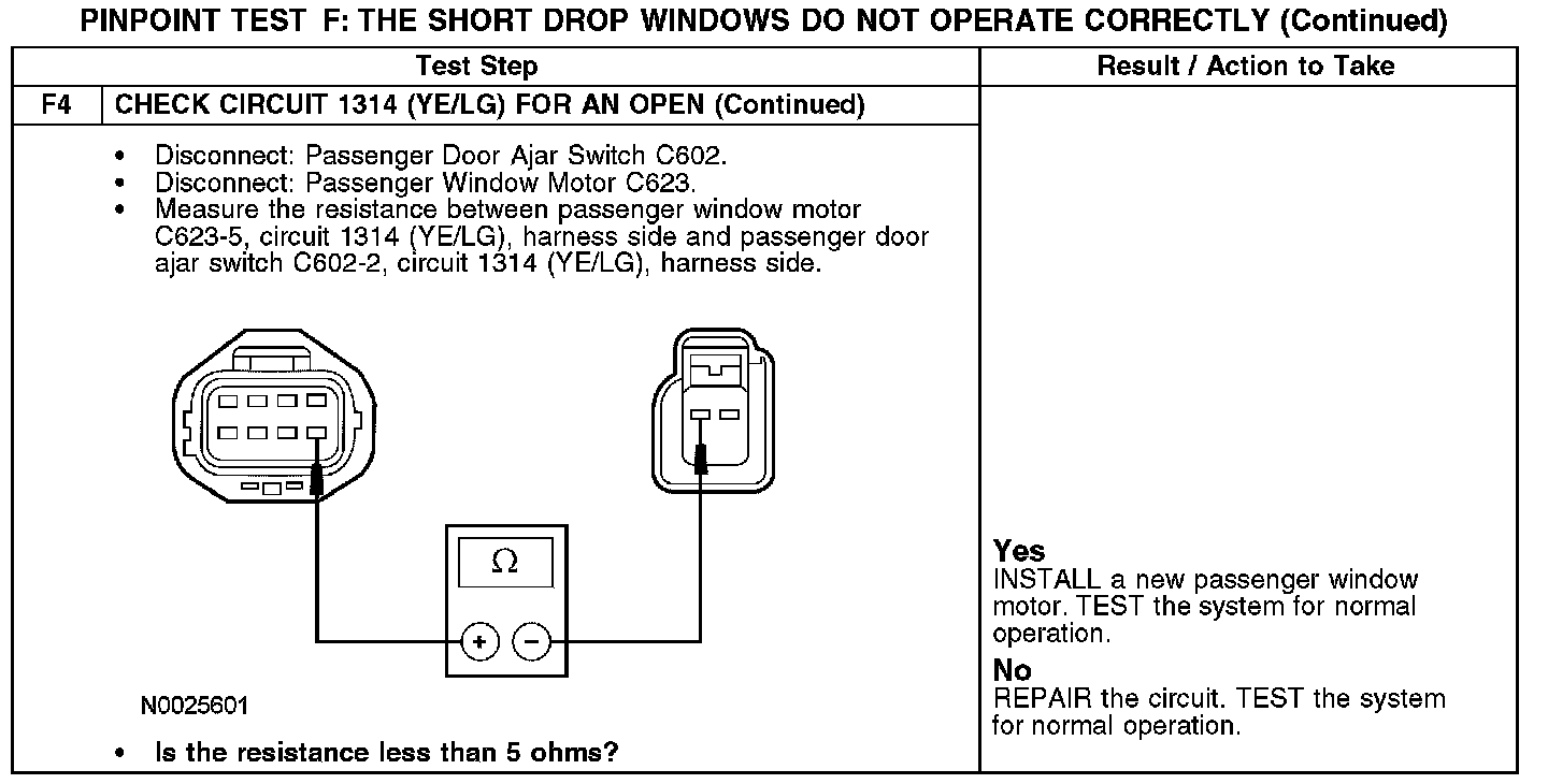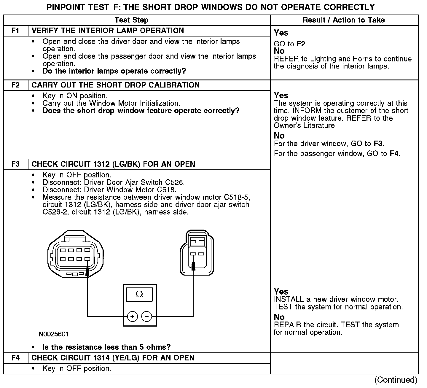 The short drop window feature is activated when one (or both) of the doors are opened, which opens a door ajar switch. When the driver door is opened (opening the driver door ajar switch), a signal on circuit 1312 (LG/BK) is interpreted by the driver window motor that the driver door is open. The driver window motor then carries out the short drop function on the driver window. When the passenger door is opened (opening the passenger door ajar switch), a signal on circuit 1314 (YE/LG) is interpreted by the passenger window motor that the passenger door is open. The passenger window motor then carries out the short drop function on the passenger window. This feature is on both the coupe and the convertible.