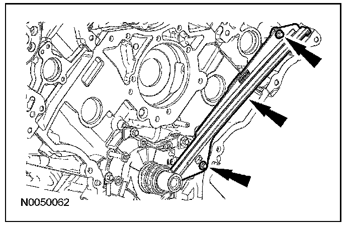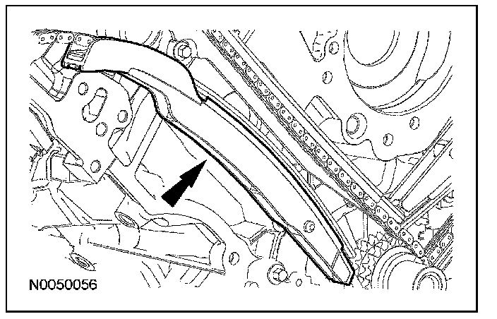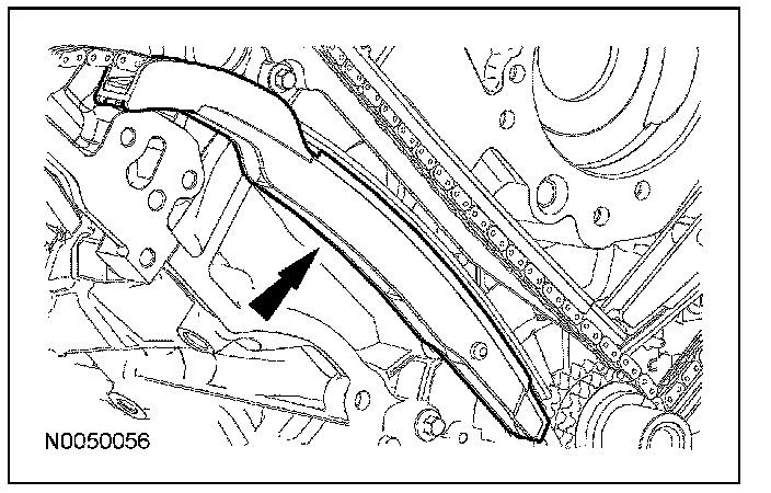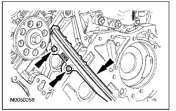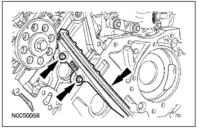 11. Remove the 2 bolts and the LH primary timing chain guide.