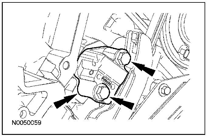 13. Install the LH primary timing chain tensioner and the 2 bolts.