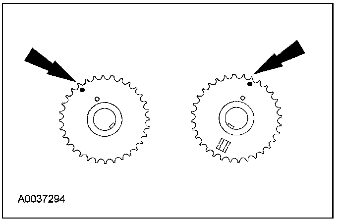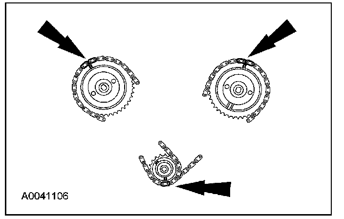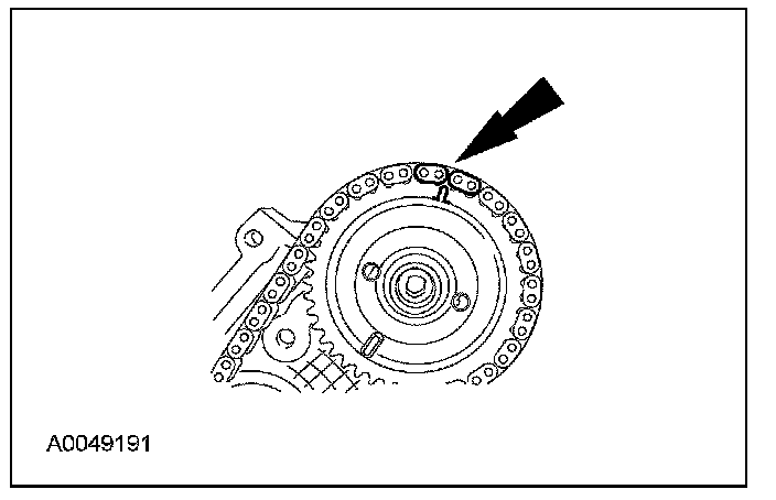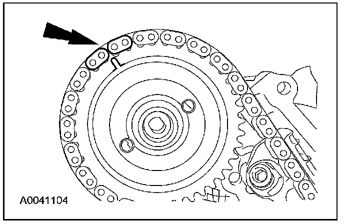 11. Install the LH timing chain on the camshaft sprocket, aligning the 2 colored links with the timing mark on the sprocket.