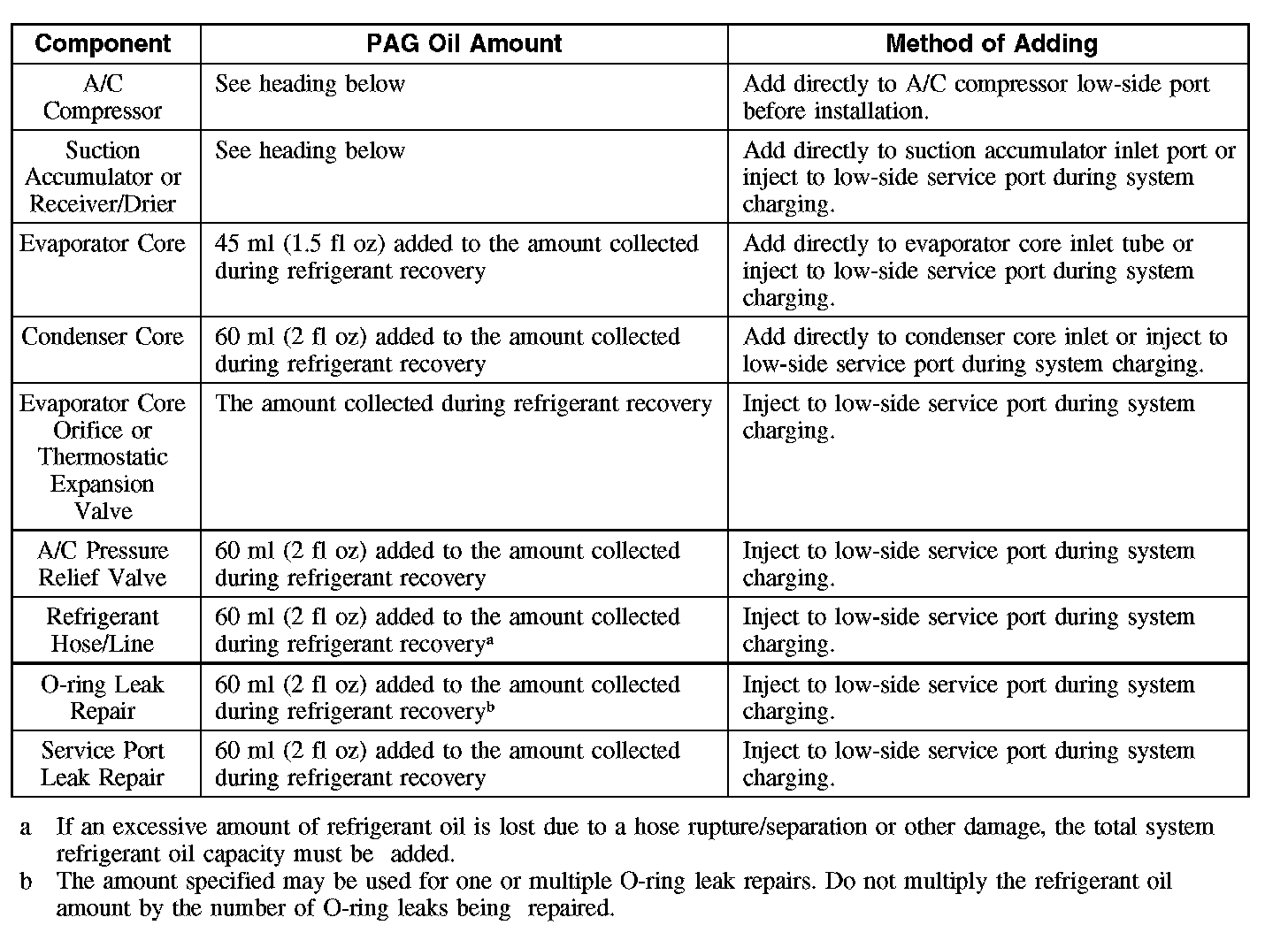 NOTE: During normal A/C operation, oil is circulated through the system with the refrigerant, and a small amount is retained in each component. If certain components of the system are removed, some of the refrigerant oil will go with the component. To maintain the original total oil charge, it is necessary to compensate for the oil lost by adding oil to the system with the new part.