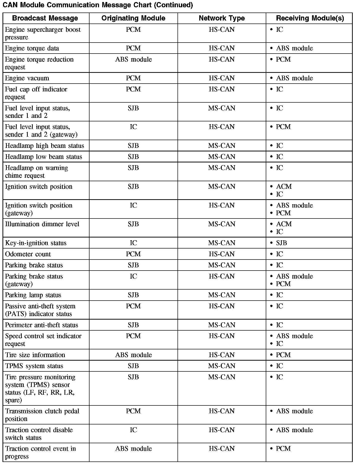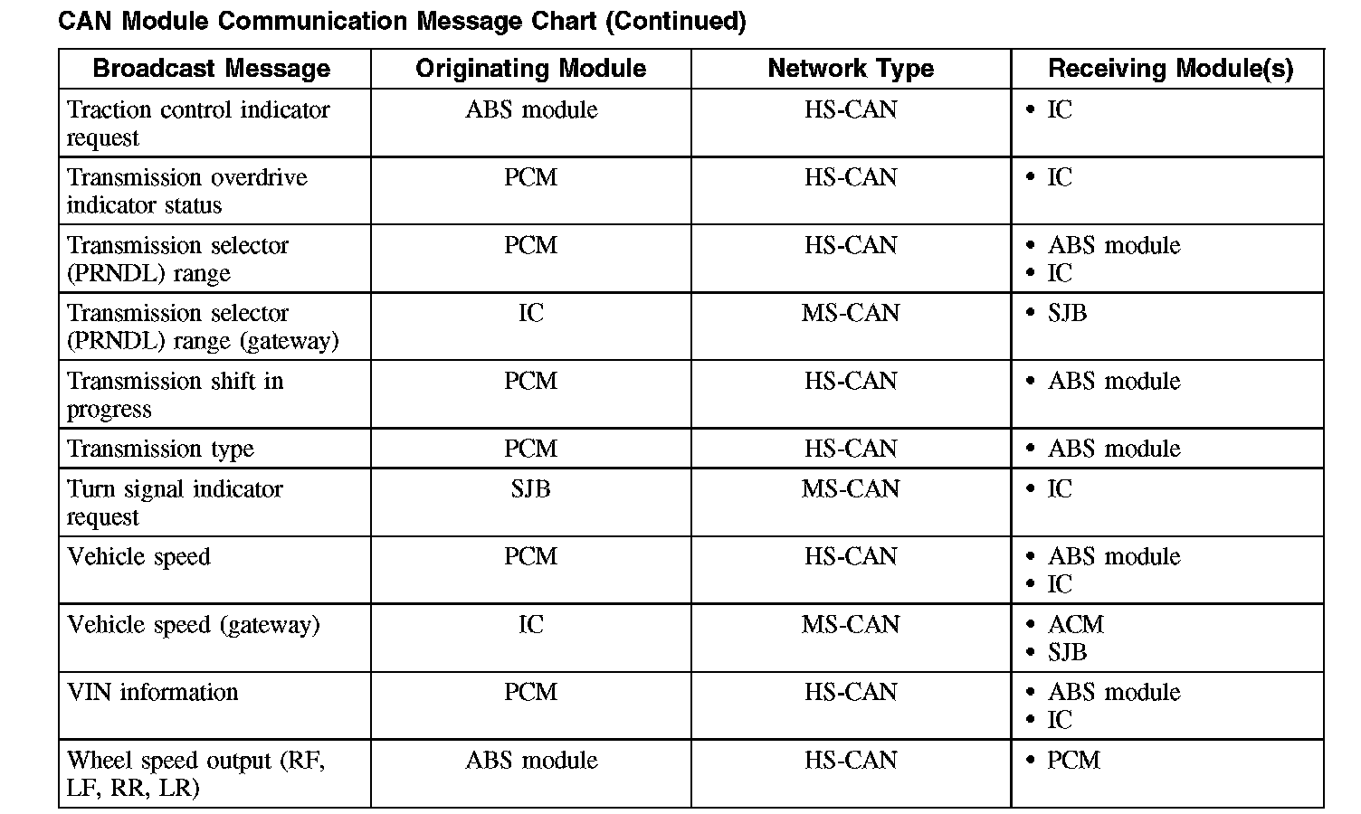 The following chart describes the specific CAN messages broadcast by each module, and the module(s) that receive the message: