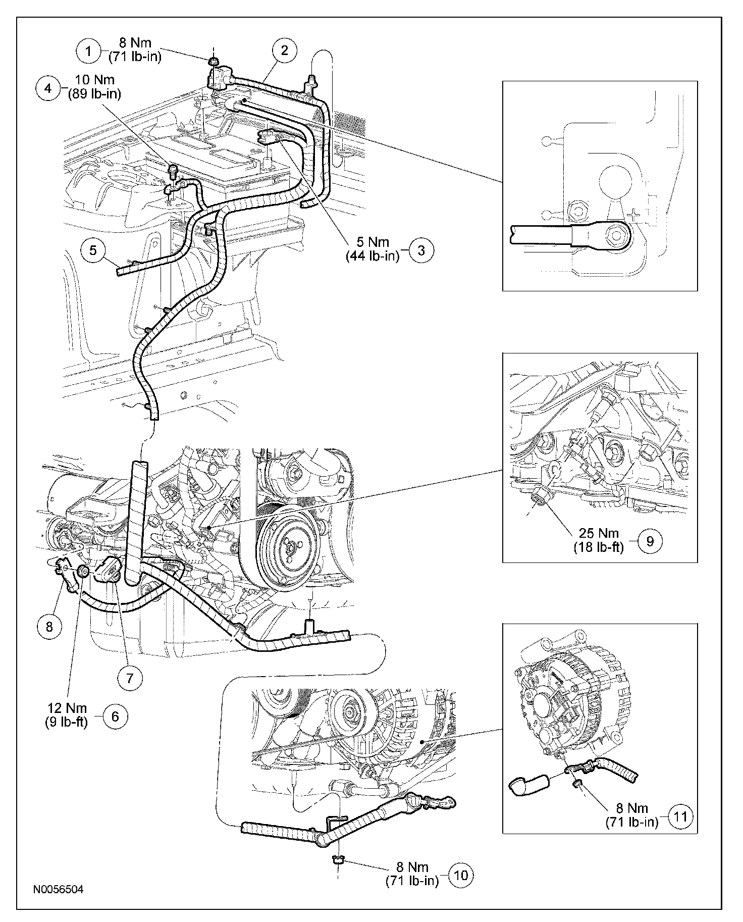 11. Remove the 2 battery cable harness locators from the RH strut tower.