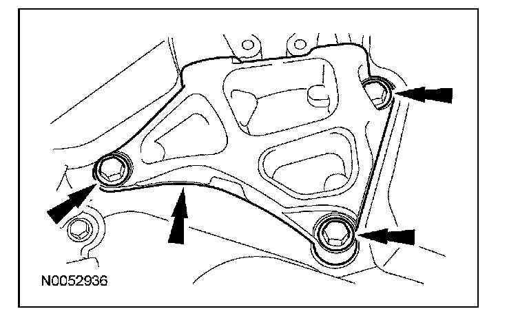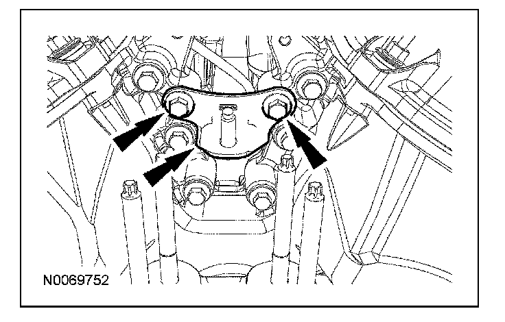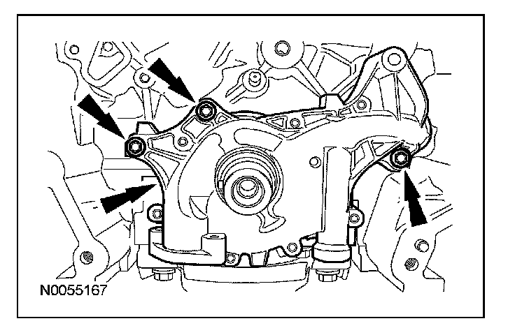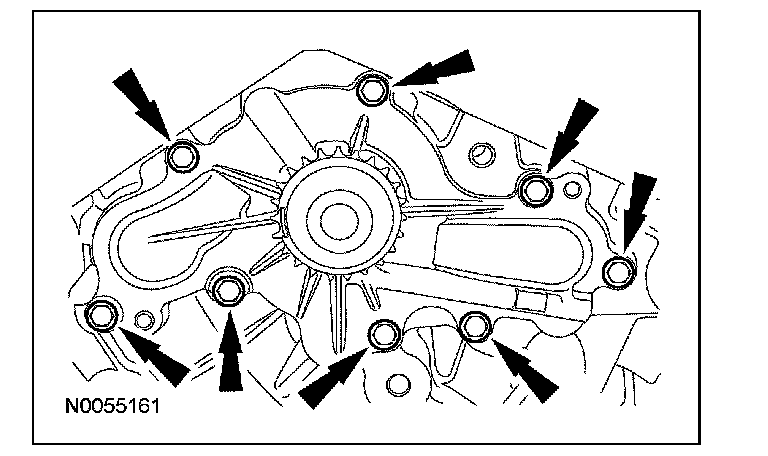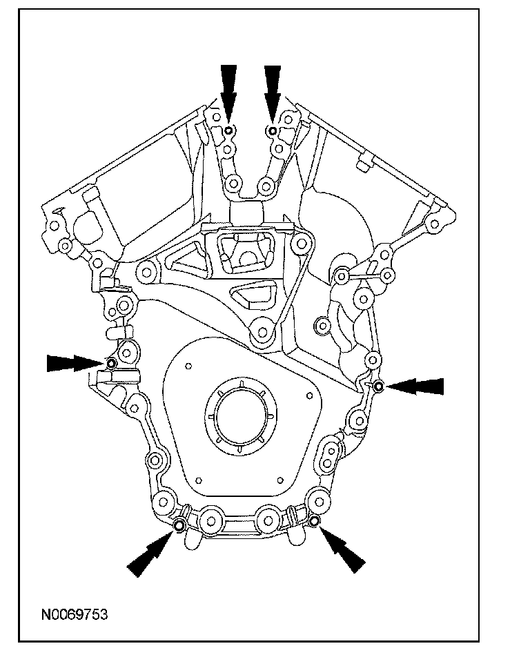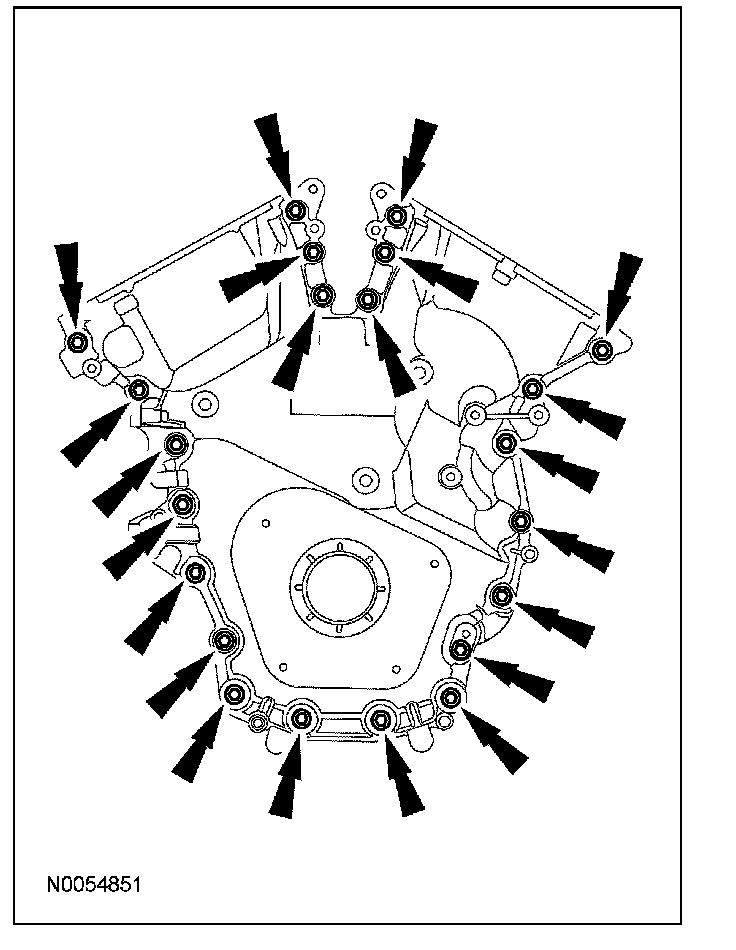 ^ Tighten the bolts one turn at a time in a criss-cross pattern until the engine front cover-to-cylinder block seal is released.