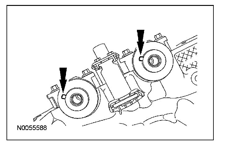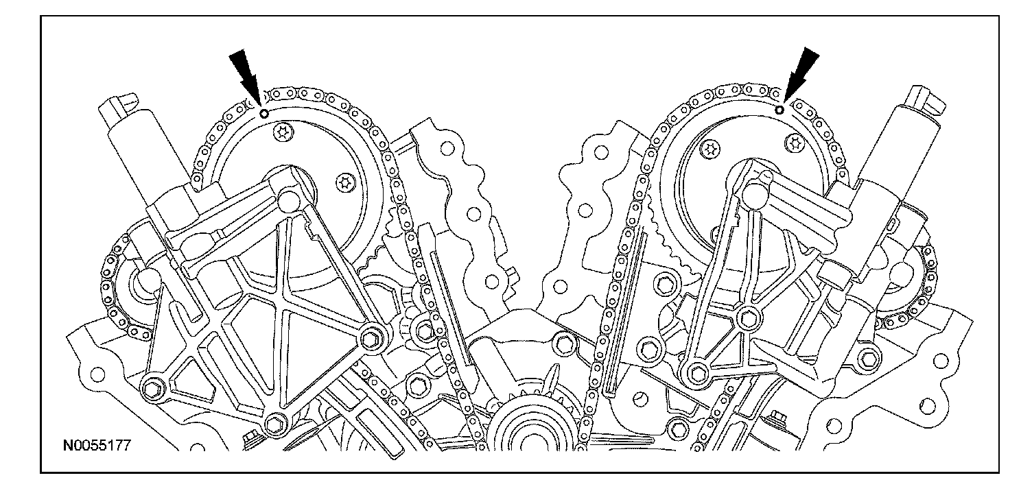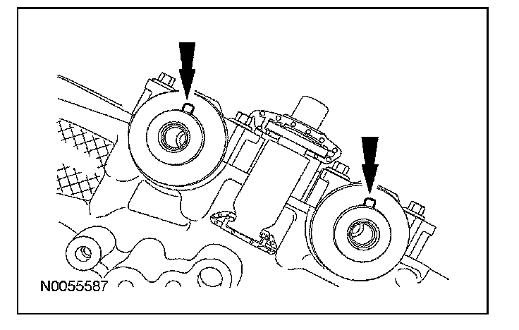 89. Rotate the crankshaft clockwise and align the timing marks on the VCT assemblies as shown.