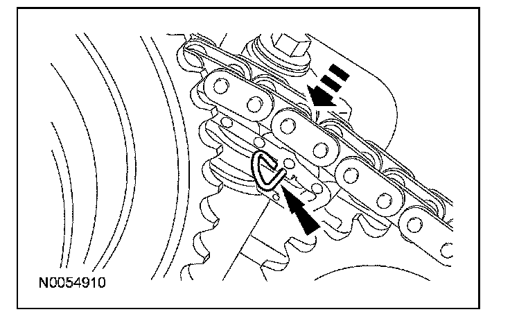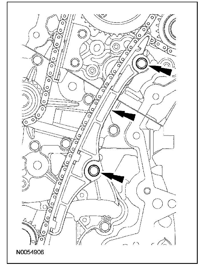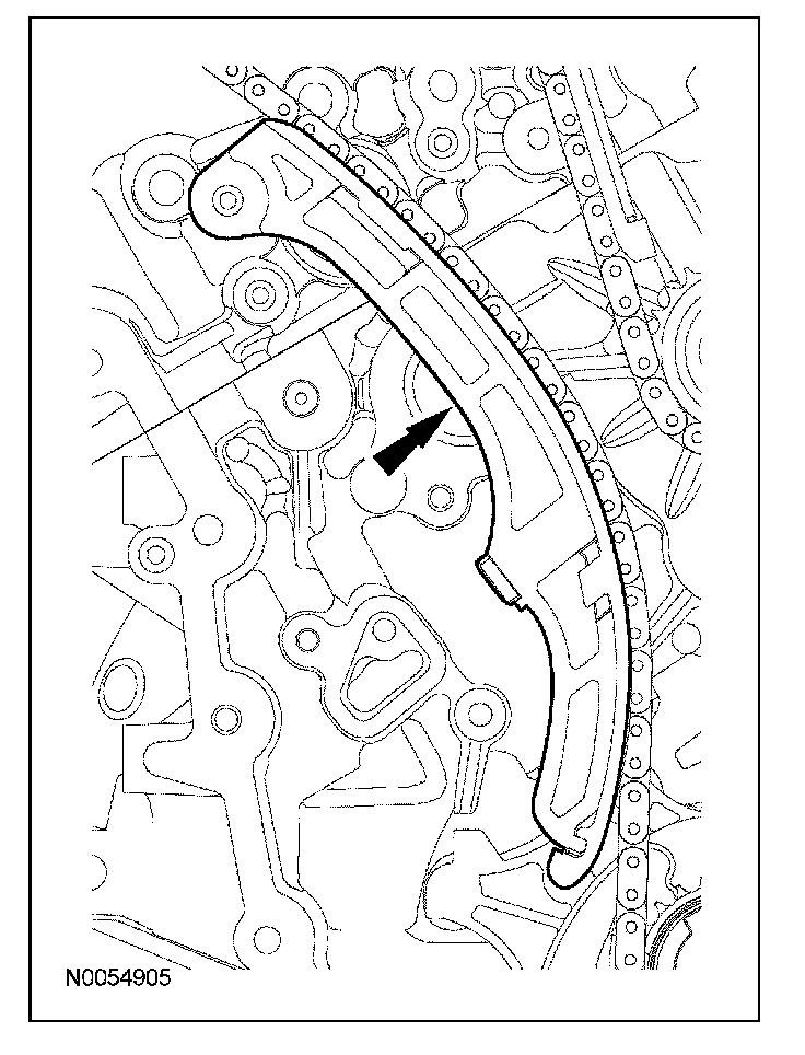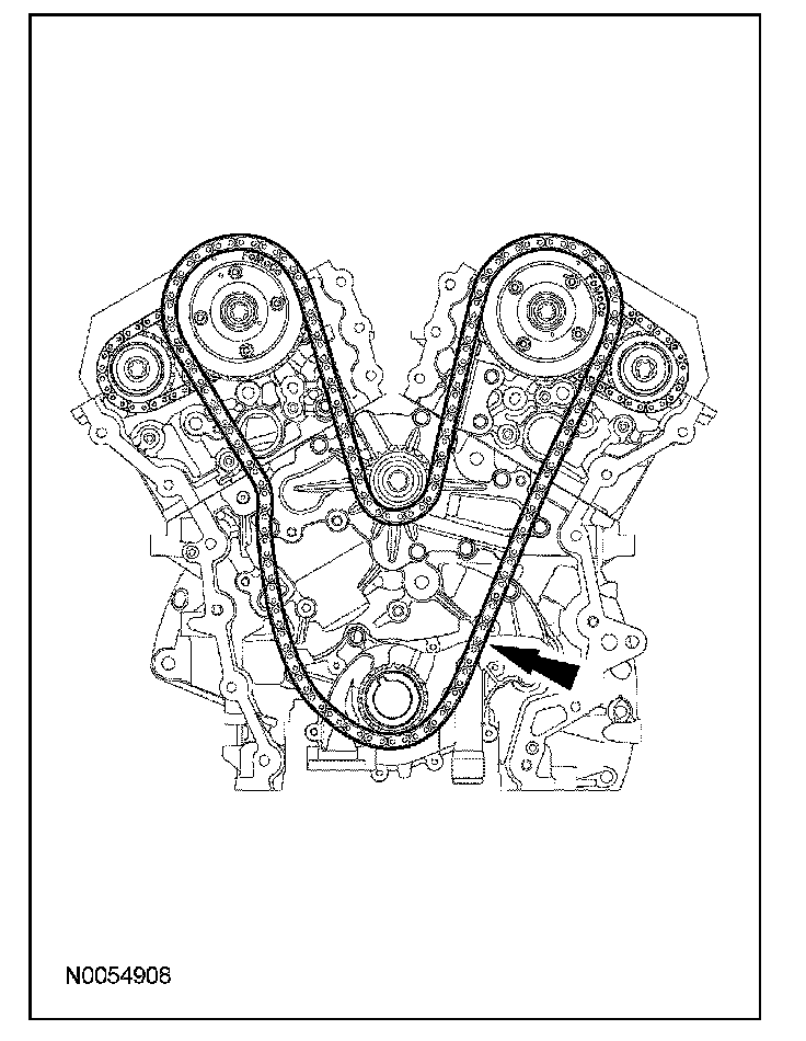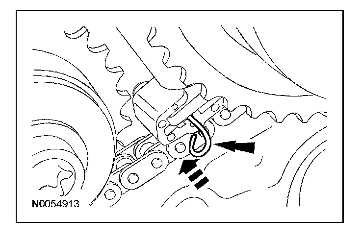107. Compress the RH secondary timing chain tensioner and install a suitable lockpin to retain the tensioner in the collapsed position.
