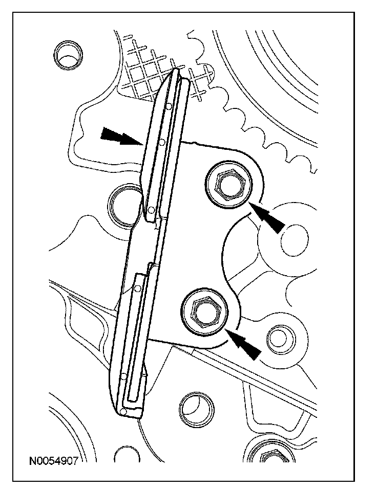 97. Remove the 2 bolts and the lower LH primary timing chain guide.