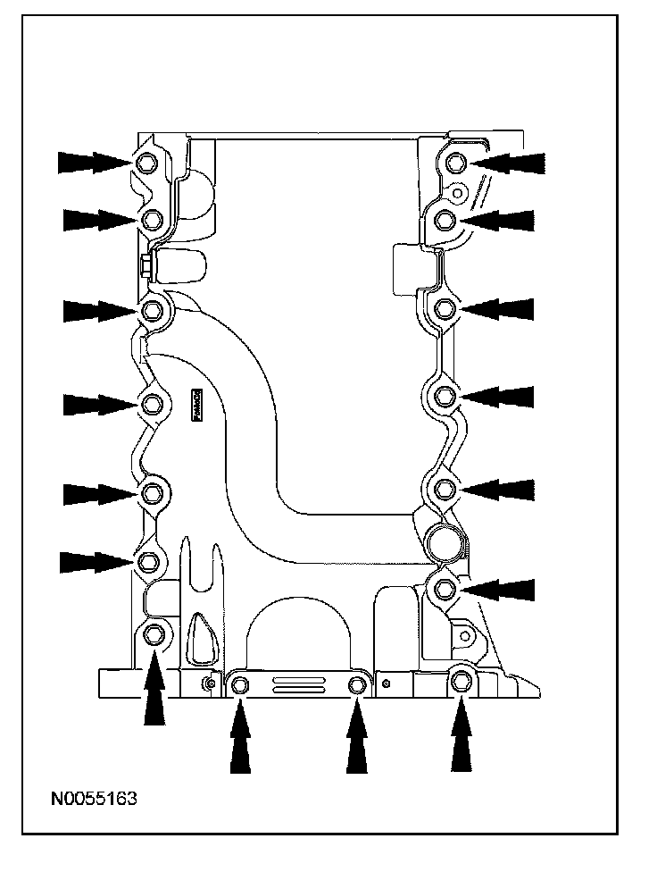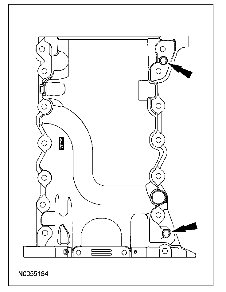 ^ Alternately tighten the 2 bolts one turn at a time until the oil pan-to-cylinder block seal is released.