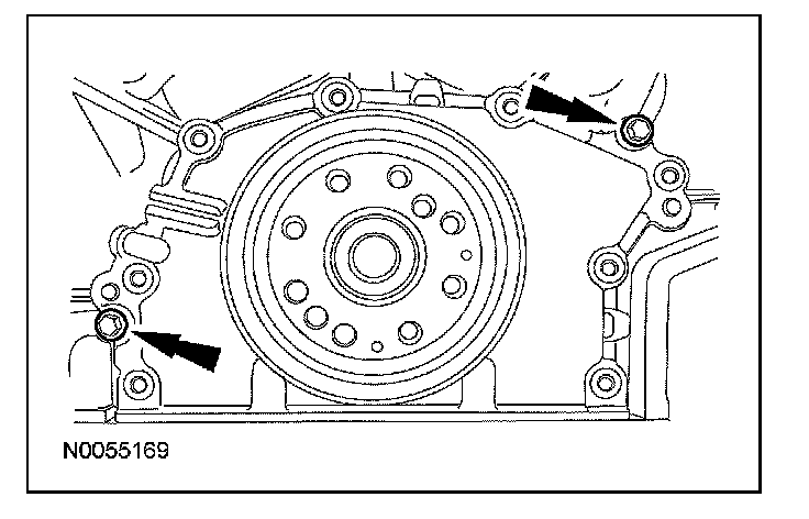 ^ Alternately tighten the 2 bolts one turn at a time until the crankshaft rear seal retainer-to-cylinder block seal is released.