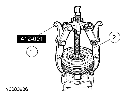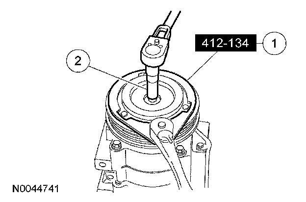 6. CAUTION: To prevent A/C compressor pulley damage, apply pressure to the inner bearing race only, or the inner and outer bearing races simultaneously.