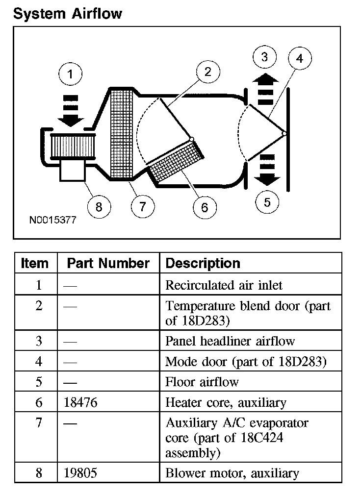 The auxiliary climate control system uses an evaporator core, which cools and dehumidifies the airflow from the auxiliary blower motor when the A/C compressor is operating. All airflow from the blower motor passes through the evaporator core.
