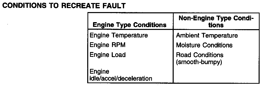Recreating the concern is the first step in isolating the cause of the intermittent symptom. A thorough investigation should start with the customer information worksheet located in the back of this manual. If freeze frame data is available, it may help in recreating the conditions at the time of a malfunction indicator lamp diagnostic trouble code (MIL DTC). Listed are some of the conditions for recreating the concern.