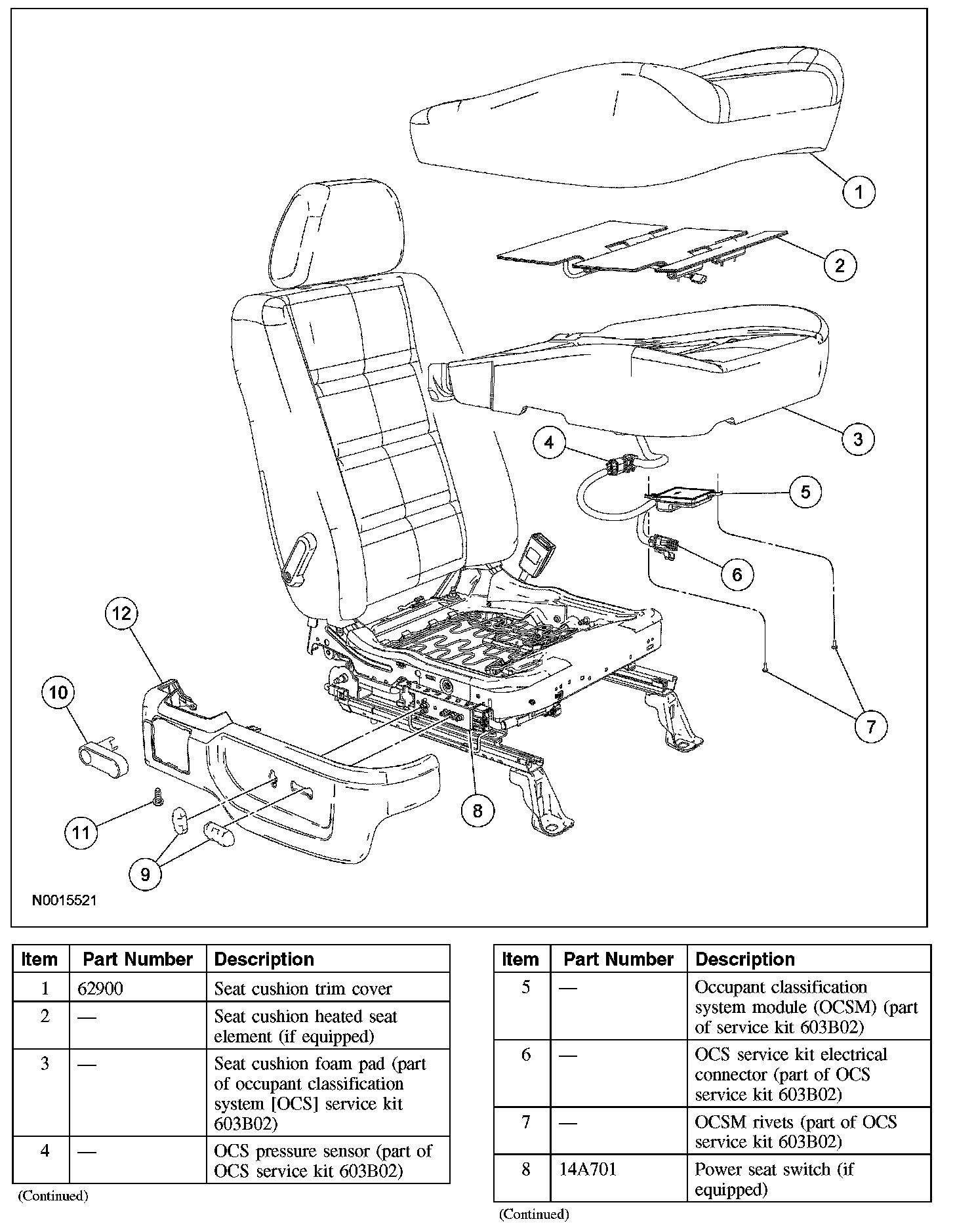 3. WARNING: Install a new occupant classification sensor (OCS) system service kit as a complete assembly. Never install only part of the kit components. Failure to follow this instruction may result in incorrect operation of the OCS system and increases the risk of serious personal injury or death in a crash.