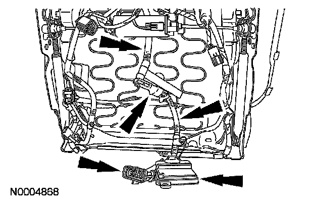 - Feed the occupant classification system module (OCSM), electrical connector, wire harness, pressure sensor and hose through the largest opening at the front of the seat cushion frame support assembly.