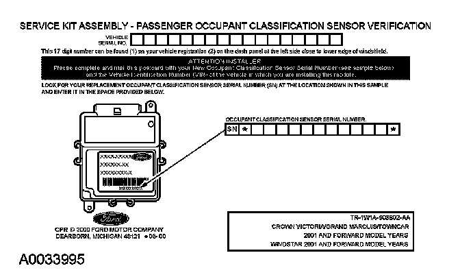 If a new OCS system was installed, fill out the necessary information on the OCS system traceability card and return it along with the complete inoperative occupant classification sensor to Ford Motor Company.
