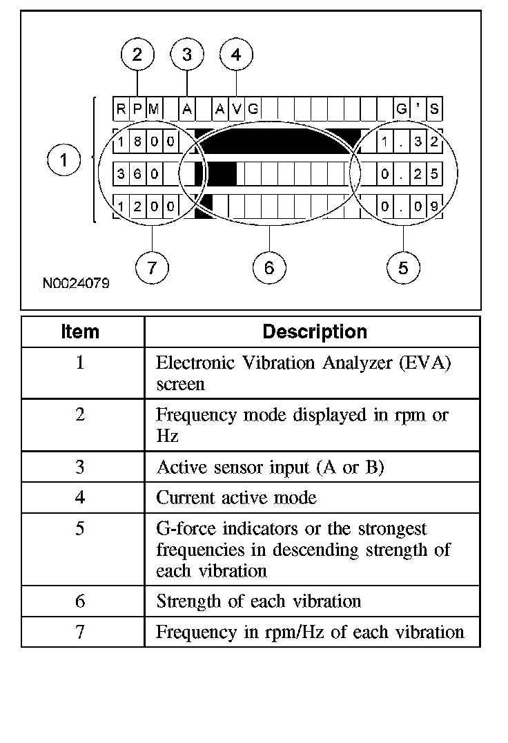 Vibrate Software(R) (Rotunda tool number 215-00003) is a diagnostic aid which will assist in pinpointing the source of unacceptable vibrations. The engine's crankshaft is the point of reference for vibration diagnosis. Every rotating component will have an angular velocity that is faster, slower or the same as the engine's crankshaft. Vibrate Software(R) calculates the angular velocity of each component and graphically represents these velocities on a computer screen and on a printed vibration worksheet. The following steps outline how Vibrate Software(R) helps diagnose a vibration symptom: