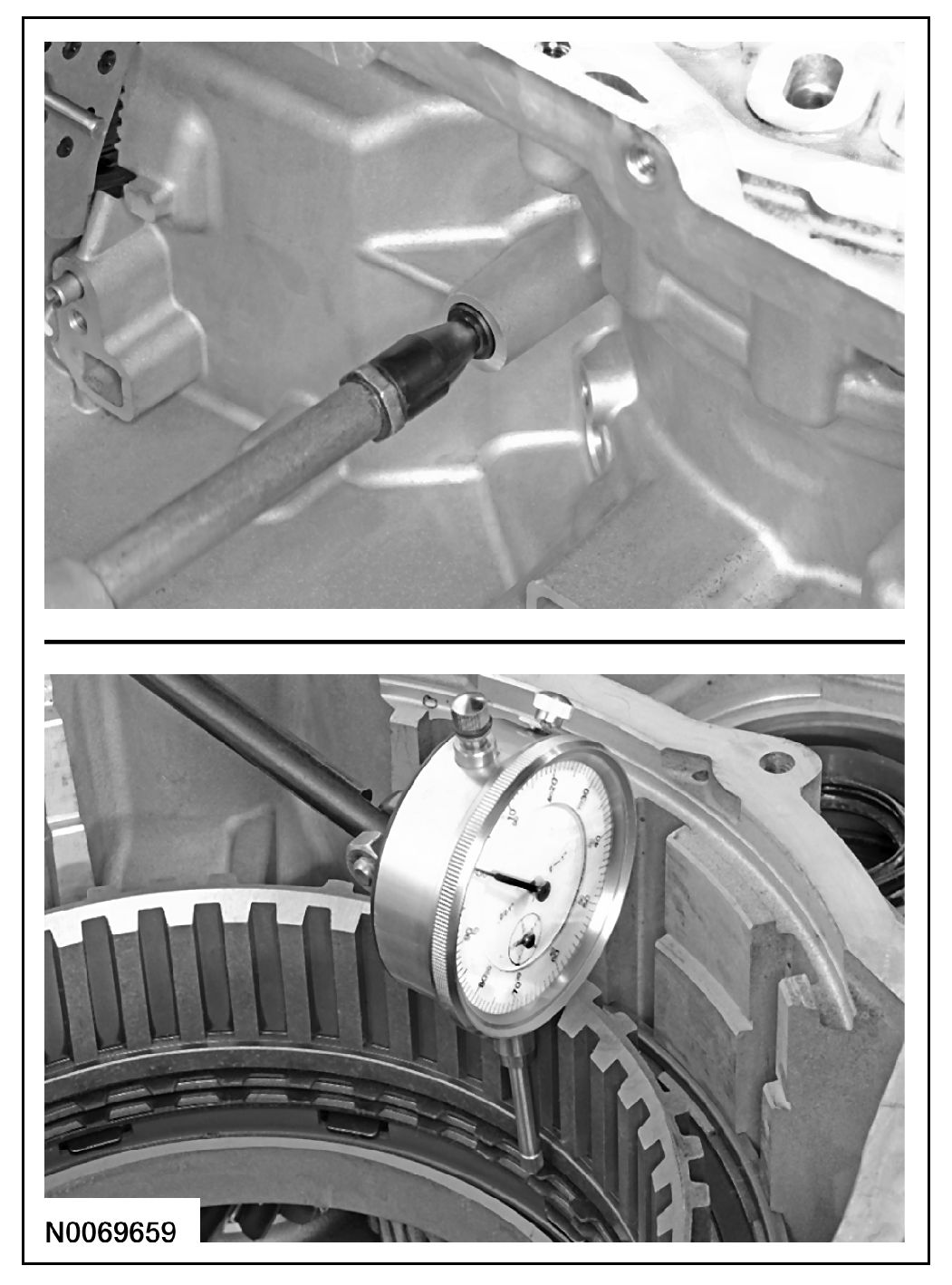 76. Apply 483 kPa (70 psi) of air pressure to the forward clutch piston port while recording the clutch pack clearance on the Dial Indicator. The clearance should be between 0.85 mm (0.033 in) and 2.41 mm (0.095 in). If the clearance is out of range, check the forward clutch pack and low OWC for correct installation. If the forward clutch pack and low OWC is correctly installed, install a new forward clutch pack.