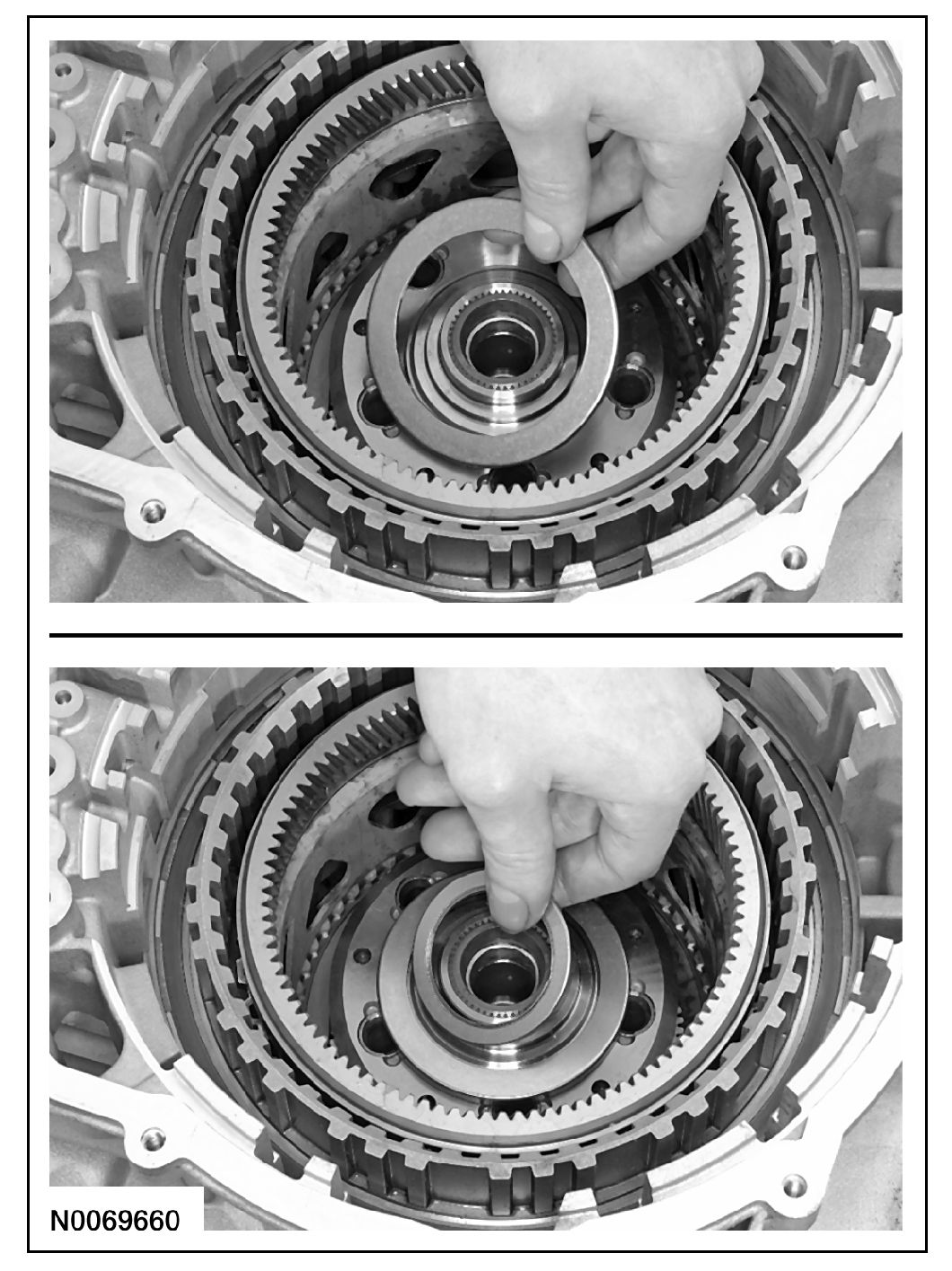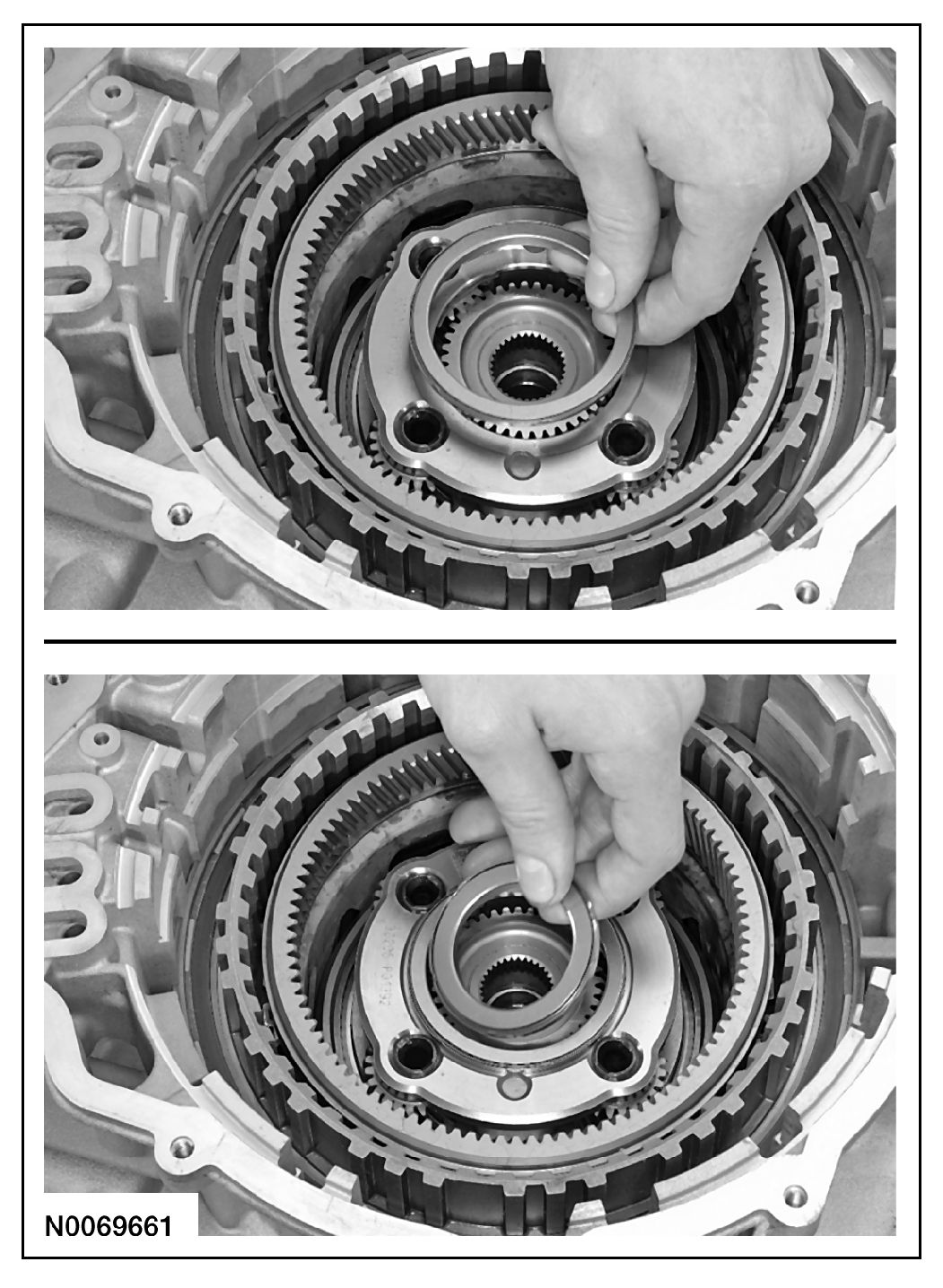 89. Measure the depth of the low/reverse clutch pressure plate where the tab fits into the gap of the low OWC snap ring and directly across from it. If the pressure plate is seated correctly, the depth should be the same. If the depths are different, rotate the snap ring so that the gap fits around the tab on the pressure plate.