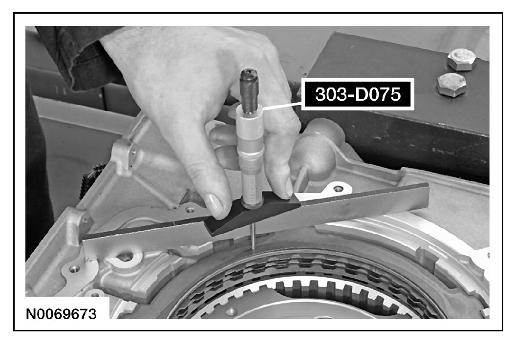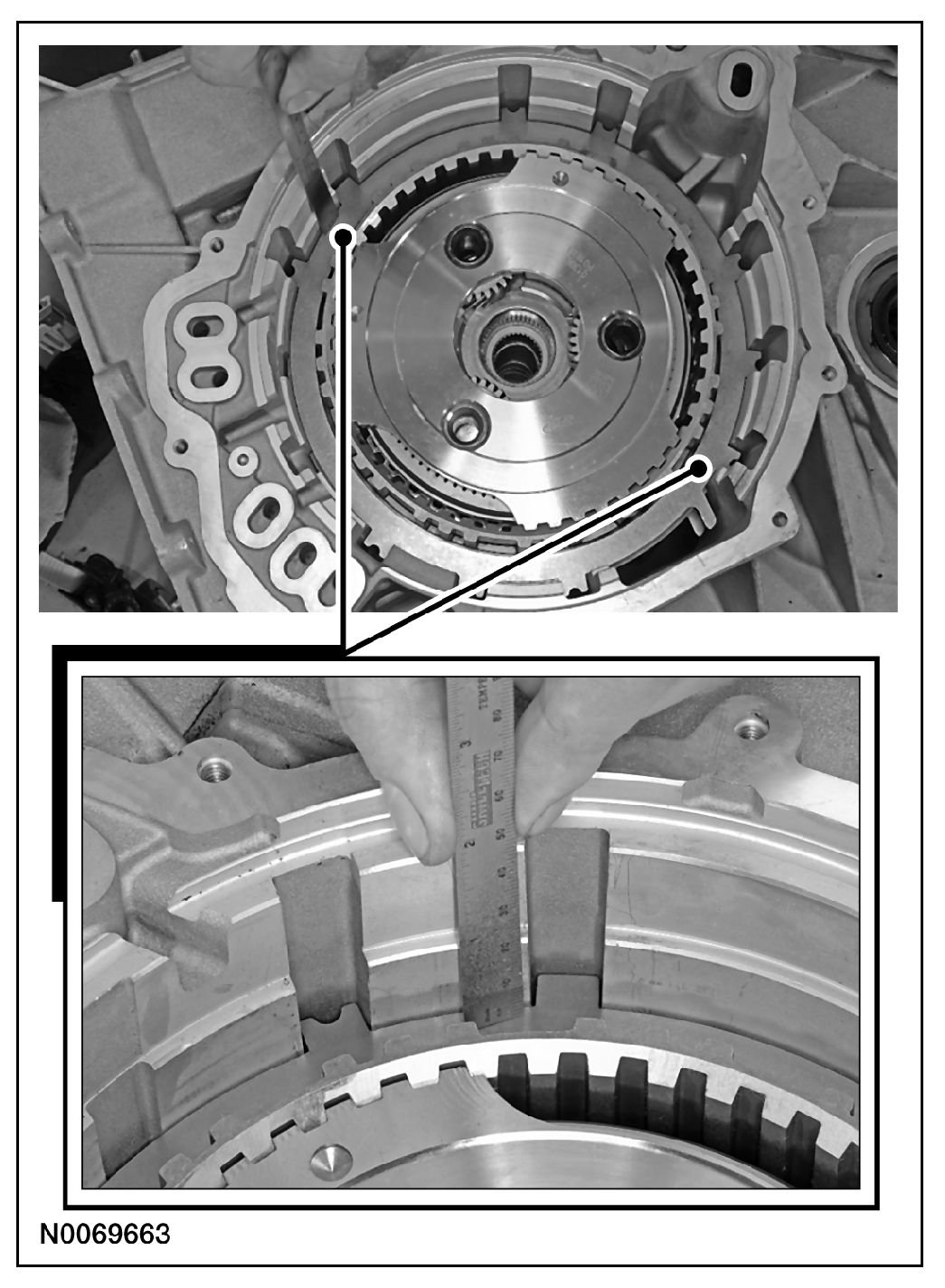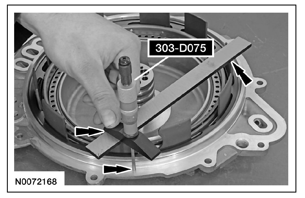 100. Using a suitable straightedge and the Depth Micrometer 303-D075, measure and record as measurement A, the distance from the transaxle case deck surface to a low point on the intermediate clutch wave spring.