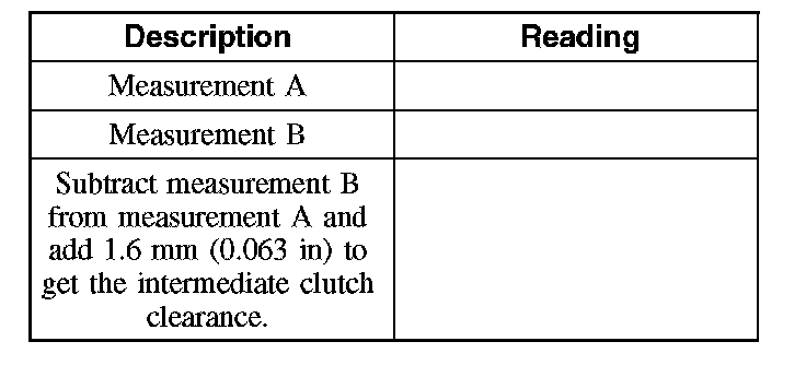 102. Subtract measurement B from measurement A and add 1.6 mm (0.063 in), to compensate for the thickness of the gasket, to get the intermediate clutch clearance. The clearance should be between 0.90 mm (0.035 in) and 2.24 mm (0.088 in). If the clearance is out of range, check the intermediate clutch pack for correct installation. If the intermediate clutch pack is correctly installed, install a new intermediate clutch pack.