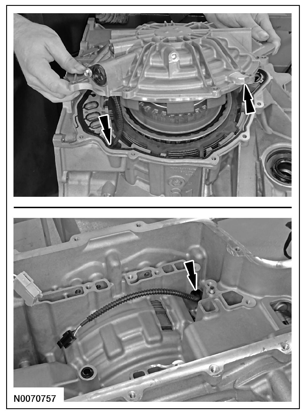 108. Route the Turbine Shaft Speed (TSS) sensor harness through the transaxle case to the valve body area and install the cover assembly.