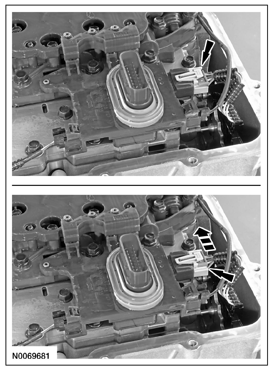 113. NOTICE: Make sure not to pinch the Turbine Shaft Speed (TSS), Output Shaft Speed (OSS) or Transmission Range (TR) sensor wiring harnesses behind the solenoid body when positioning the solenoid body in place.
