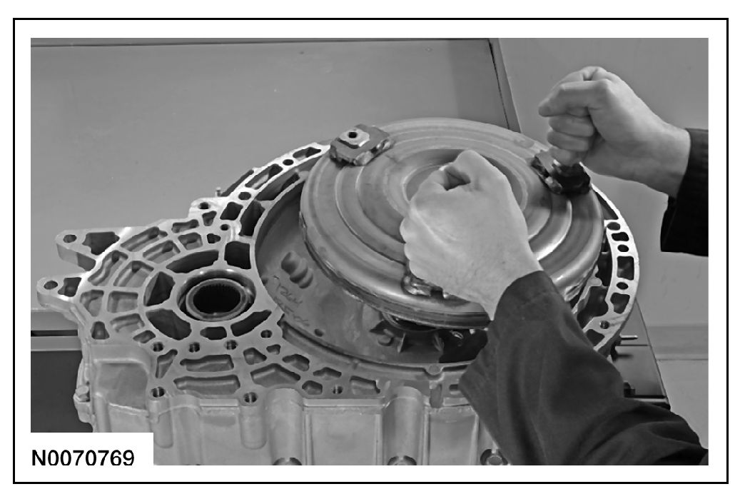 122. NOTICE: Only thread the bolts 6 to 8 turns or do not exceed 12 mm (0.472 in) in the torque converter. If the bolts are threaded too far, damage to the torque converter clutch surface can occur, causing torque converter failure.